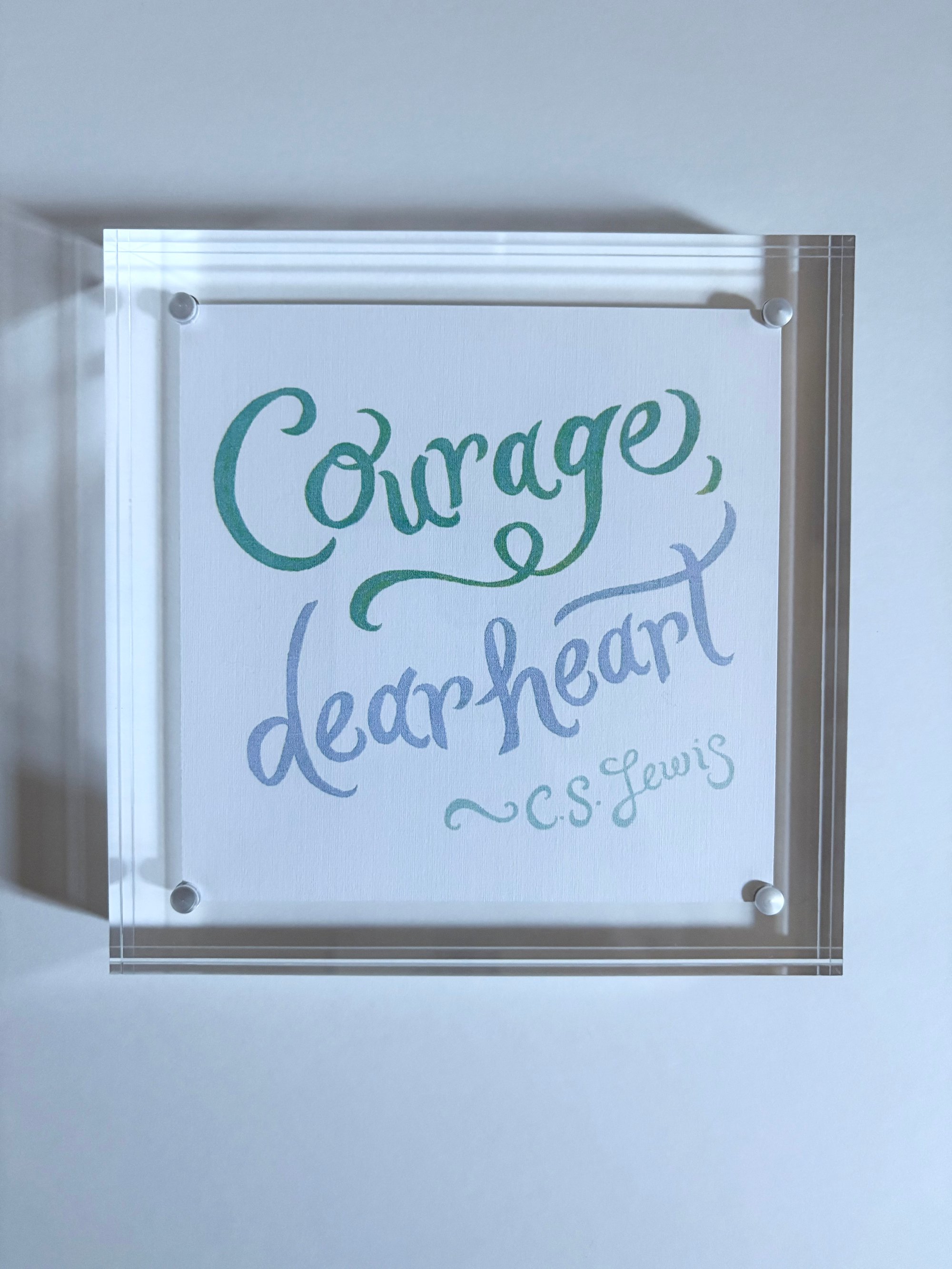 Courage Dear Heart print, 5x5 in a 6x6 acrylic frame.